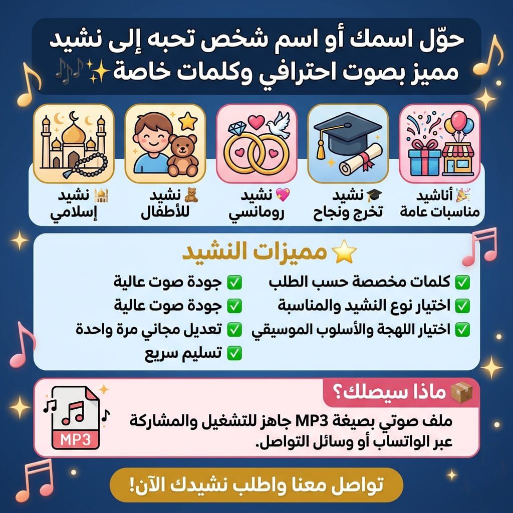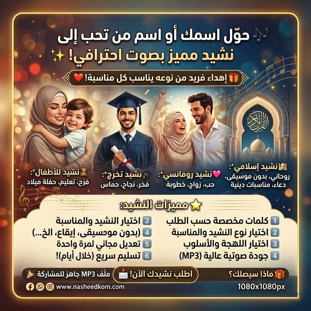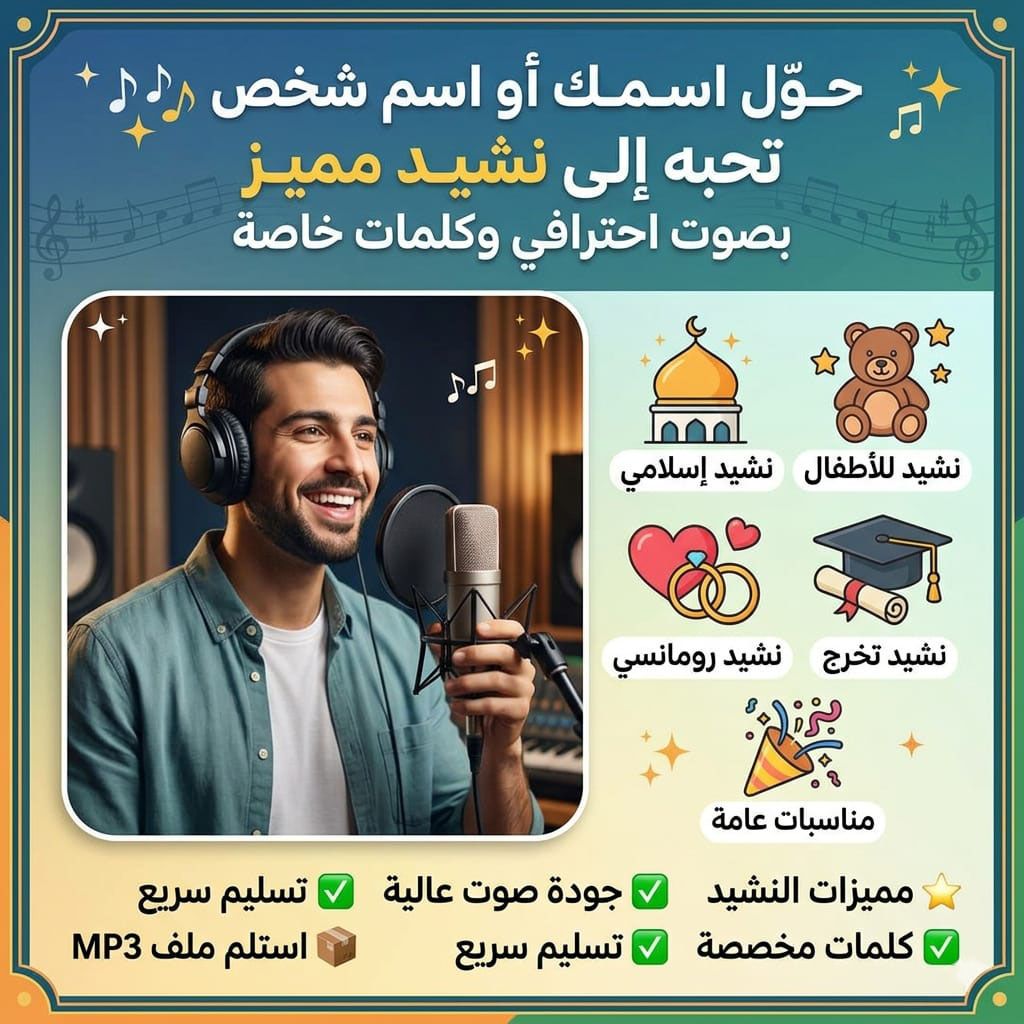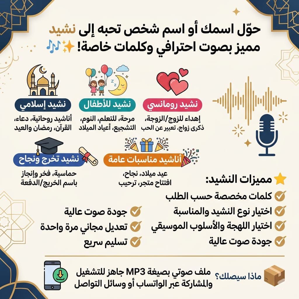 نقوم بصناعة نشيد مخصص بالكامل يناسب مناسبتك ويعبر عن مشاعرك بطريقة جميلة ومؤثرة ❤️