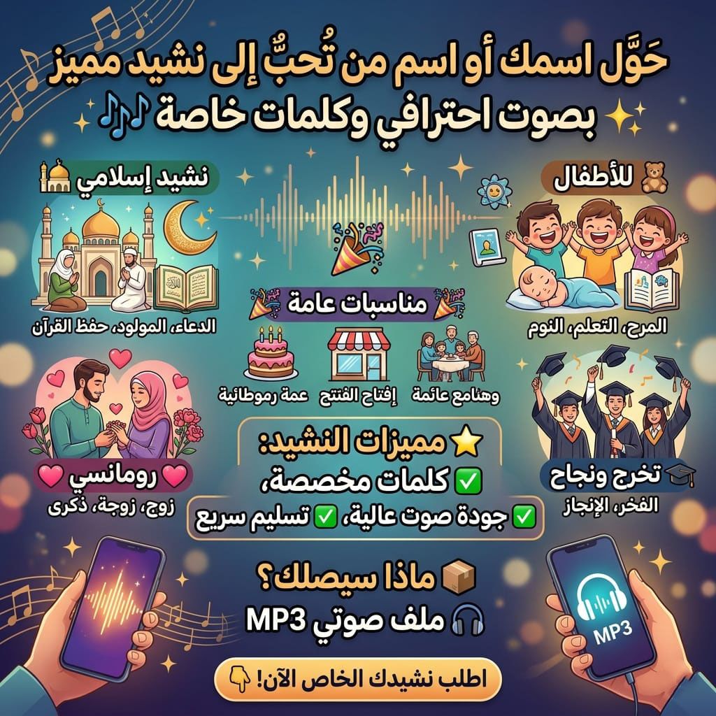 حوّل اسمك أو اسم شخص تحبه إلى نشيد مميز بصوت احترافي وكلمات خاصة 🎶✨